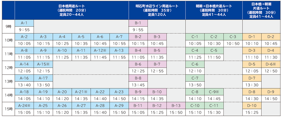 別表のうち、※が付いている便に乗船できます。車いすでの乗船を希望する場合は、備考欄(はがき、FAXの場合は余白でも可)に「車いす使用」と記入してください(当日、乗降の際にスタッフがお手伝いします)。