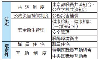 区の福利厚生事業は、法律で定めている法定事業と、事業主として実施している法定外のものとに分けられます。