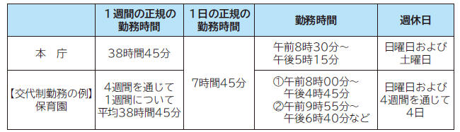 職員の勤務時間などは、「中央区職員の勤務時間、休日、休暇等に関する条例」で定められています。職員に割り振られている主な勤務形態は次のとおりです。
