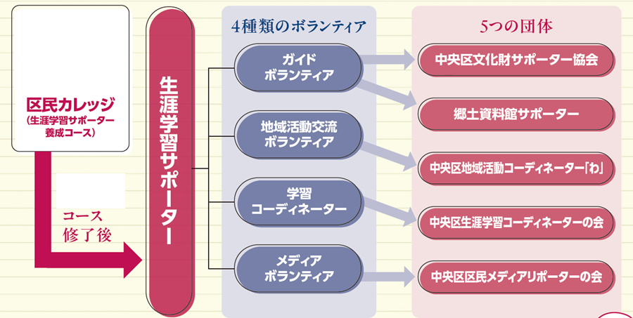 ・中央区生涯学習サポーターとは、区民の学びの場「中央区民カレッジ」の生涯学習サポーター養成コース修了生によるボランティアです。