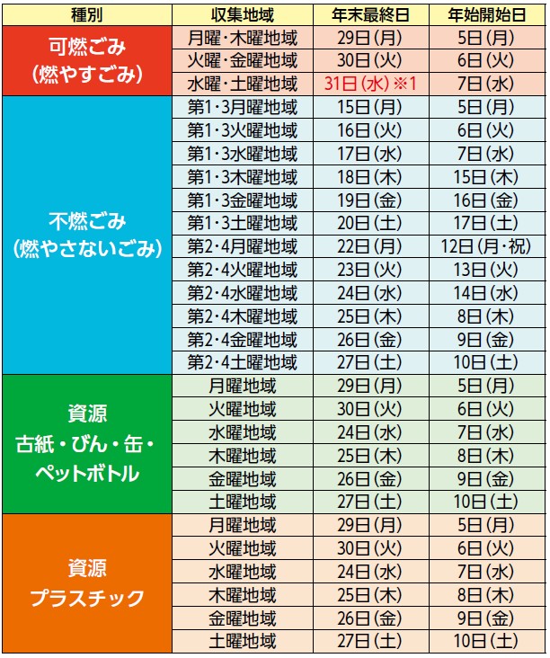 ※1 収集間隔が大きく空くことから臨時収集を行います。1月5日(月)から通常どおりの収集に戻ります。