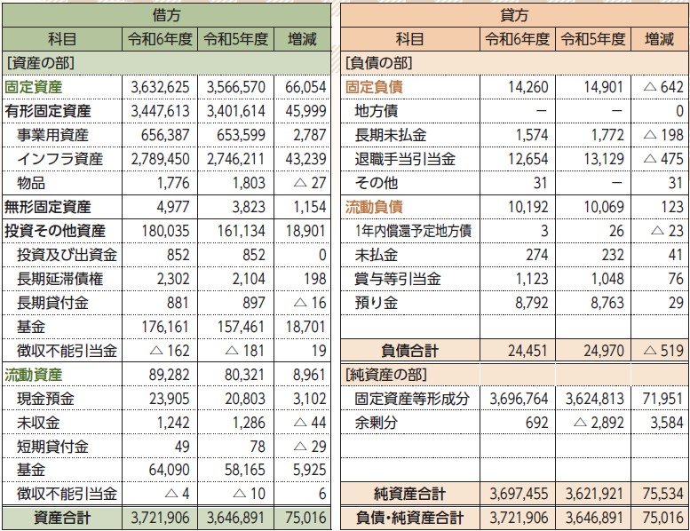 行財政の健全な運営のためには、一定の純資産の確保が必要です。令和6年度は北青山三丁目地区市街地再開発に伴う道路予定地の取得等により、令和5年度と比べて純資産は755億円増加の3兆6,975億円となりました。