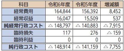 行政コスト計算書において、令和5年度と比べて経常費用は85億円、経常収益は5億円それぞれ増加しました。経常収益と経常費用を比較することにより、行政サービスの提供に対する受益者負担の状況をみる受益者負担率は、9.7パーセントとなりました(表4参照)。