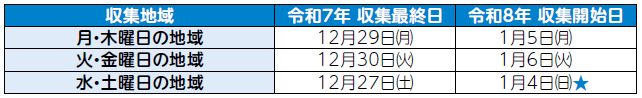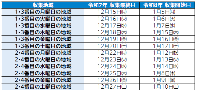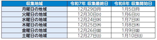 下表の収集最終日・開始日を確認し、収集日の午前8時までに出してください。年末年始は、資源やごみの量、交通事情により収集時間が変わる場合があります。