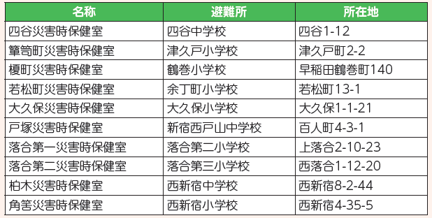 これまで区内10か所の避難所に併設していた医療救護所は、災害時保健室(下表)に名称を変更し、保健師等がこころとからだの健康相談を行い、必要に応じて医療機関や専門職に引き継ぎます。