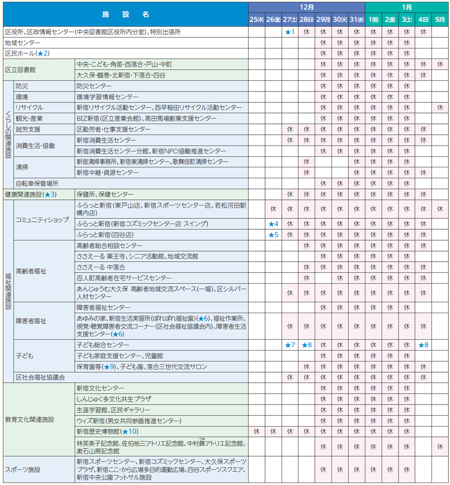 年末年始の期間、区の主な施設は、下表のとおり休みます。