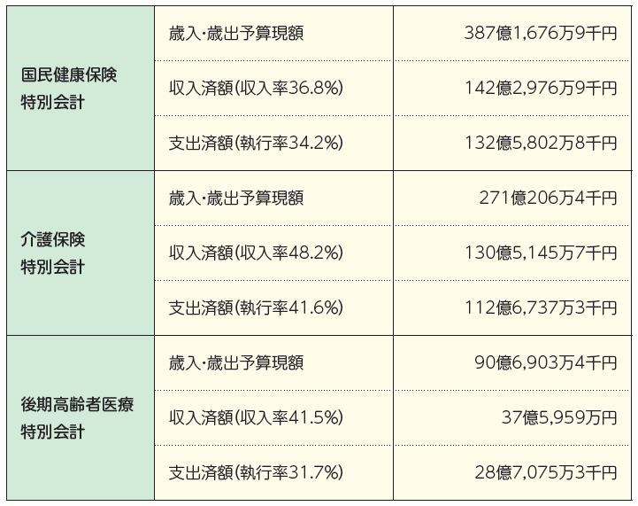 7年度上半期は、国民健康保険特別会計で1回の補正を行い、6,140万5千円を減額しました。9月末現在の予算現額、収入・支出の状況は下表のとおりです。