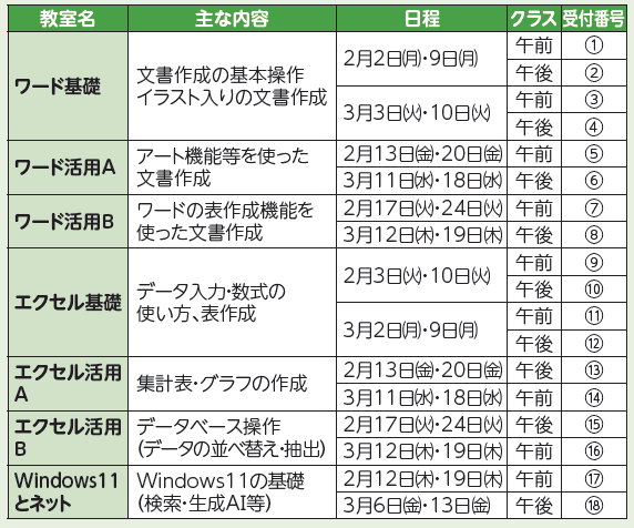 日時・期間・内容:下表のとおり。午前クラスは午前9時30分~12時、午後クラスは午後1時~3時30分、各全2回