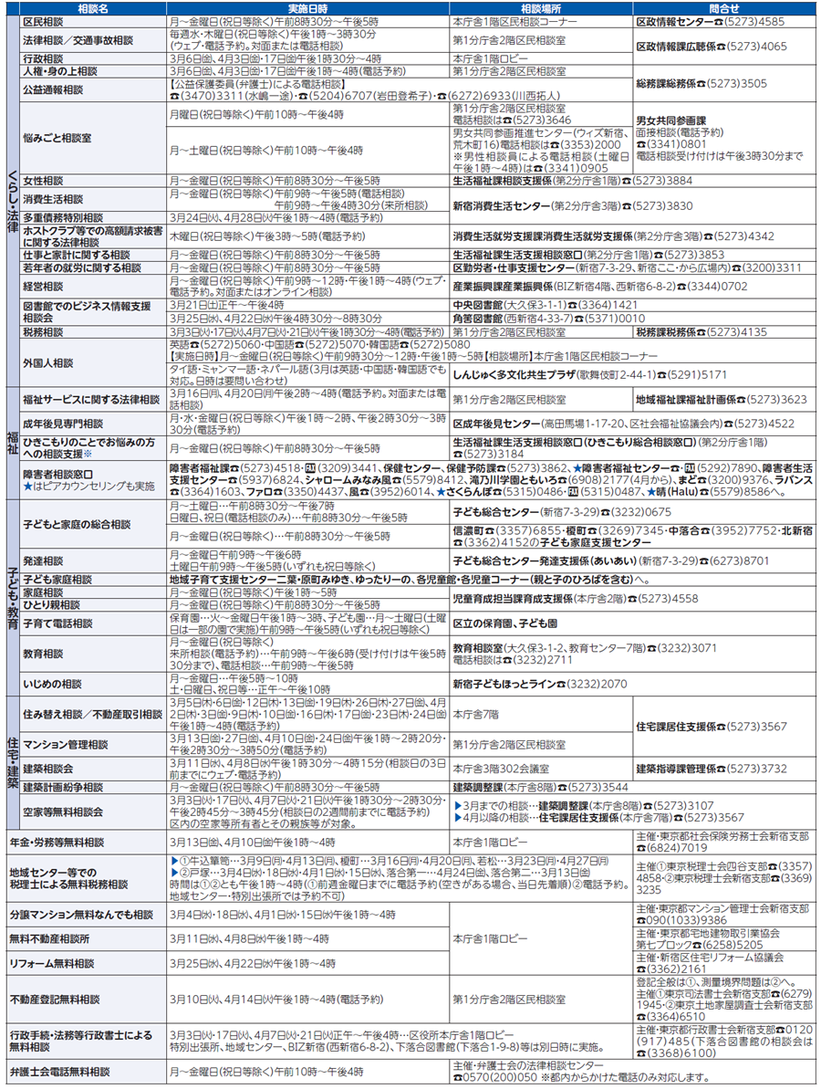くらし 3月・4月の各種相談 26/30 前の記事 次の記事 記事を読み上げる 発行日 : 2026年02月15日 自治体名 : 東京都新宿区 広報紙名 : 広報新宿 令和8年2月15日号(第2526号) 中止・変更となる場合があります。事前に各主催者へご確認ください。 ※相談名が4月から「ひきこもりや生きづらさのことでお悩みの方への相談支援」に変わります。 Tweet シェアする 2月は22日 第4日曜日の区役所本庁舎窓口開設 令和9年1月のはたちのつどいで晴着を無料で貸し出します