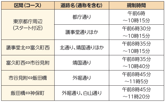 当日は、コース周辺で下表のとおり交通規制が行われます。規制する区間、時間等をご確認ください。沿道の商店街、事業者の皆さんは、当日のごみ出しの自粛にご協力ください。詳しくは、同イベントホームページ(本紙右二次元コード。【HP】https://www.marathon.tokyo/about/traffic/)をご覧ください。