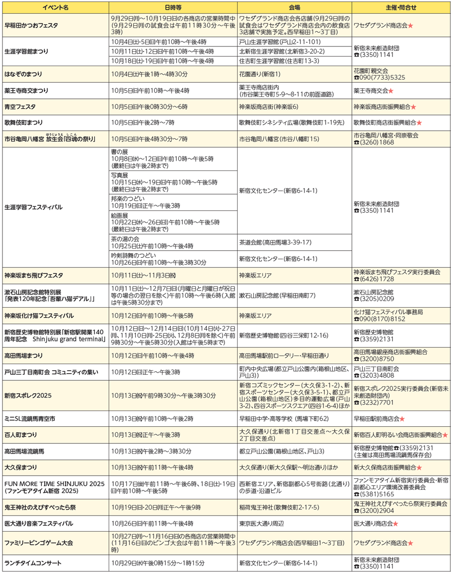区内各所の秋のイベントをお楽しみください。詳しくは、文化観光課・特別出張所・地域センター・区立図書館等で配布しているパンフレットや新宿区ホームページ(本紙右二次元コード)等でご案内しています。日時等は変更する場合があります。