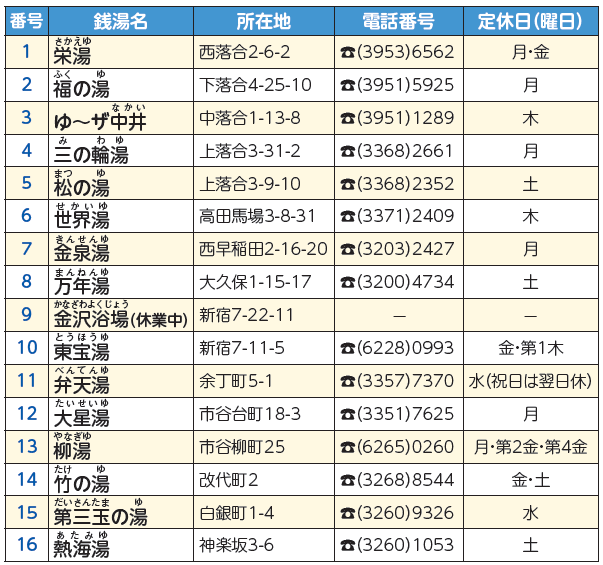 区内には16の銭湯(下表)があります。露天風呂やサウナがある浴場、浴室の壁画が楽しめる浴場、レトロな雰囲気が味わえる浴場など、個性ある銭湯をお楽しみください。詳しくは、新宿浴場組合ホームページ(本紙右二次元コード。【HP】https://1010yuge-g.jp/)をご覧ください。