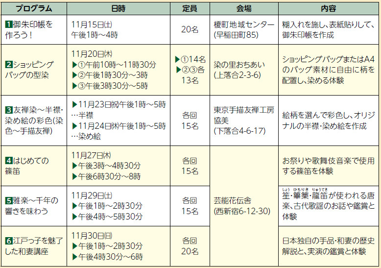 申込・申請方法:はがきかファックスに「はがき・ファックス等の記入例」のほかプログラム名((1)~(6)の別)・(1)以外は希望日時を記入し、10月23日(必着)までに問合せ先へ。応募者多数の場合は、区内在住の方を優先して抽選。