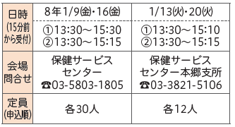 申込・問合せ:電子申請又は往復はがきに「記入例」1〜6と7生年月日(3・7は子ども分も)を明記し、〒112-8555 文京区子ども家庭支援センター【電話】03-5803-1104へ