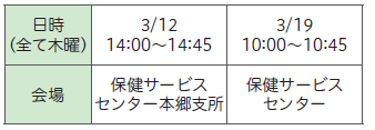 会場・申込・問合せ:2月19日(木)から電話で保健サービスセンター健康相談係【電話】03-5803-1805へ