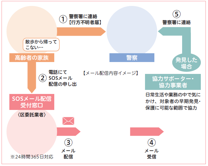 「ただいま!支援SOSメール」は、認知症の症状による行方不明が発生したとき、その方の情報(写真・服装等)を協力者に一斉メール配信し、可能な範囲で捜索に協力いただき、迅速な発見・保護につなげます。協力いただける区民の方、区内事業所の方は、メール受信の登録をお願いします。