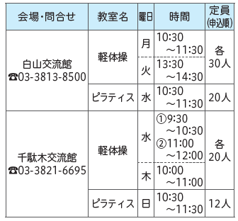 申込・問合せ:10月25日(土)午前10時(千駄木交流館ピラティス教室は、同日午後1時)から電話又は直接各交流館へ