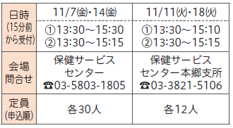 日時:11月21日(金)(1)午前10時30分~11時30分(2)午後1時~2時(10分前から受付)