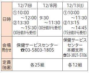 対象:区内在住で就労等により平日の母親学級に参加できない20週以降の初妊婦