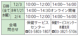 申込・問合せ:はがき(1人1枚)に「記入例」1〜4と7生年月日・性別(在勤者は勤務先名・所在地、在学者は学校名、以前利用していた方は承認番号も)を明記し、〒112-8555 文京区保健サービスセンター健康相談係【電話】03-5803-1805へ