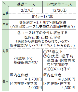 健康センターで運動をするためには、基礎コース又は心電図等コースへの参加が必要です。