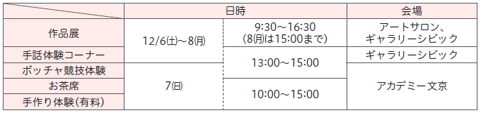 小・中学校の特別支援学級や障害者施設・個人・団体などの作品展示のほか、「ボッチャ競技体験」などを行います。