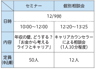 ※保育[対象…6か月〜就学前児、定員…10人(申込順)]希望者は、12/3(水)12:00までに電子申請又は電話で女性しごと応援キャラバン運営事務局へ
