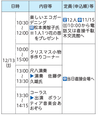 内容:岩崎弘記念文京ジュニア吹奏楽団によるクリスマスコンサート(ホルン・トランペット・打楽器などの楽器体験あり)