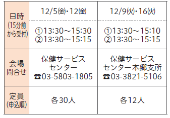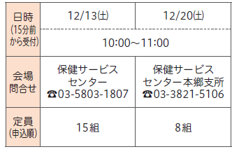 日時:12月19日(金)(1)午前10時30分~11時30分(2)午後1時~2時(10分前から受付)