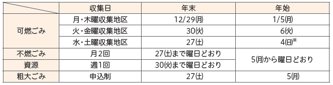 ※可燃ごみの水・土曜収集地区は、臨時に日曜収集を実施
