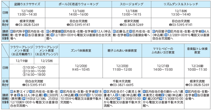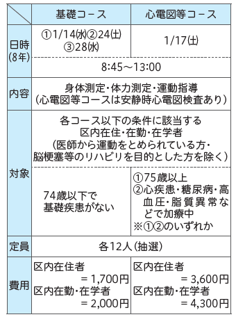 申込・問合せ:はがき(1人1枚)に「記入例」1〜4と7希望日(基礎コースは第3希望まで記入可)・生年月日・性別(在勤者は勤務先名・所在地、在学者は学校名、以前利用していた方は承認番号も)を明記し、〒112-8555 文京区保健サービスセンター健康相談係【電話】03-5803-1805へ
