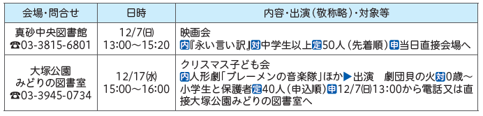 日時:12月7日(日)(1)午前11時(2)午後1時30分(各回30分程度)