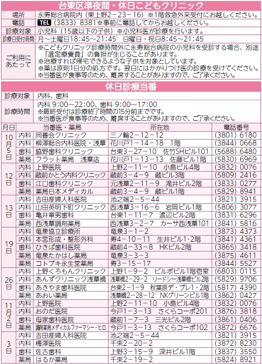 都合により、当番を変更することがあります。当番医、台東区夜間・休日診療案内電話等にご確認のうえ、受診してください。
