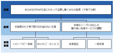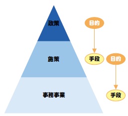 行政活動を便宜的に階層化すると、一般的には、政策・施策・事務事業の3層構造として捉えることができます。政策とは、行政の大局的な目的や方向性を示すもの、施策とは、政策を実現するための具体的な手段であり、それはさらに施策を実現するための複数の事務事業から構成されています。