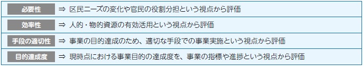 「必要性」「効率性」「手段の適切性」「目的達成度」の4つの視点(表1)による評価と区民生活への影響を踏まえ、今後の方向性として「拡大」「改善」「維持」「縮小」「廃止・終了」の5種類で評価しています。