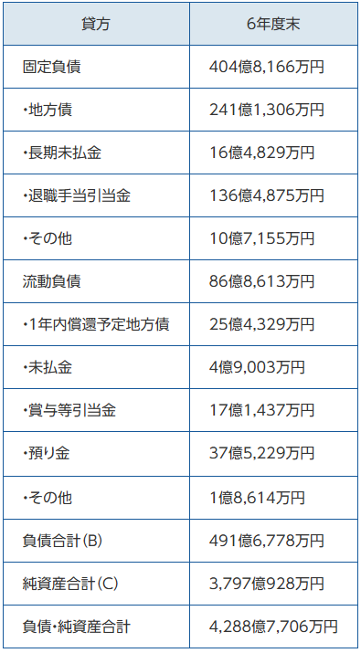 会計年度末(基準日)時点で、区がどのような資産を保有し、その資産がどのような財源で賄われているのか、また、将来支払わなければならない負債がどのくらいあるかを示した表です。6年度は、資産合計(A)が約4,289億円、負債合計(B)が約492億円、純資産合計(C)は約3,797億円となりました。