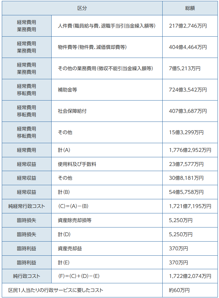 行政サービスに要したコスト(費用)と、受益者負担等の収益を示した表です。6年度は、純経常行政コスト(C)が約1,722億円に対し、臨時損失(D)が5,250万円、臨時利益(E)が370万円でした。その結果、純行政コスト(F)は約1,722億円となりました。このコストは、区民の皆さんの税金や国・都からの交付金などで賄われています。