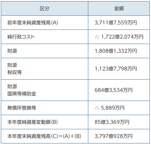 貸借対照表(表3)の「純資産合計」に計上されている数値の1年間の変動を示した表です。5年度末の純資産残高(A)が約3,712億円に対し、6年度末の純資産残高(C)は約3,797億円となり、約85億円増加(B)しました。