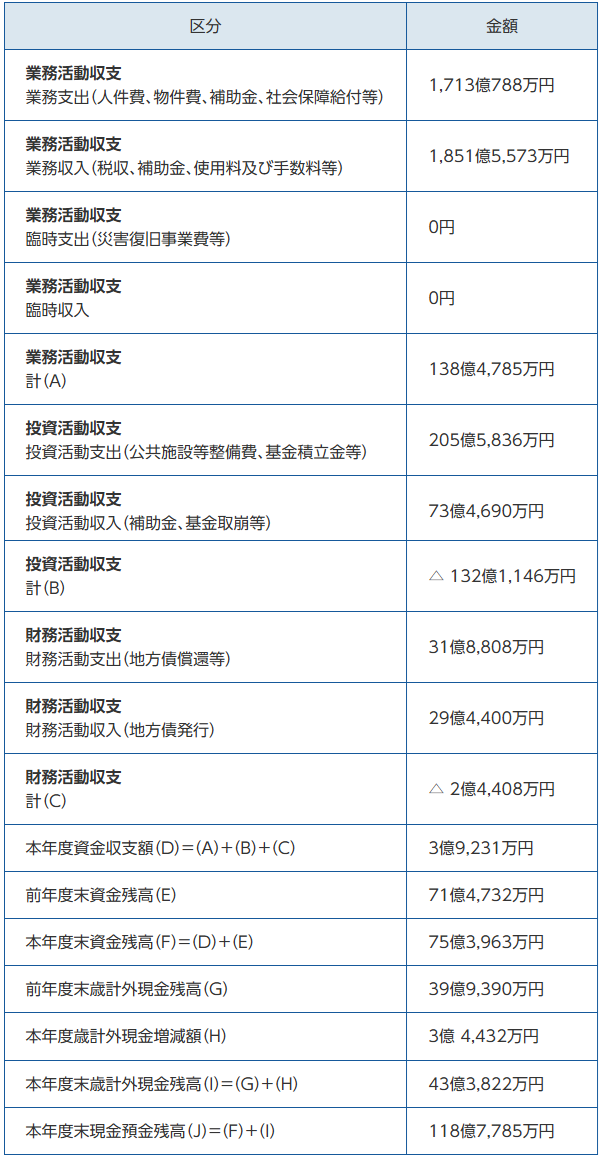 一会計年度において、資金がどのように調達・活用されたかを、3つの区分に分けて示した表です。業務活動収支で、6年度は約138億円の余剰(A)が生じました。これが、道路・学校等の公共施設整備や、基金の積立・地方債の償還などの投資・財務的活動の財源となっています。6年度の資金収支は約4億円の増加(D)となり、歳計外現金は約3億円の増加(H)となったことから、年度末現金預金残高(J)は、約119億円となっています。