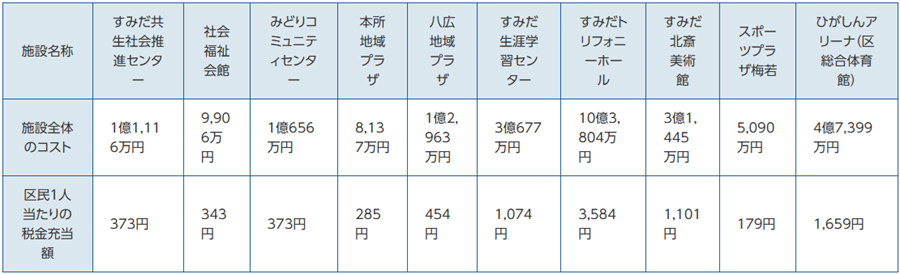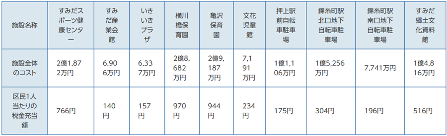 主要な公共施設における施設全体のコスト(人や管理運営にかかるコストなど)の状況を明らかにし、区民1人当たりの税金充当額など単位別のコストを示した表です。これらのコストを基に、より効率的・効果的な施設の管理運営に努めていきます。