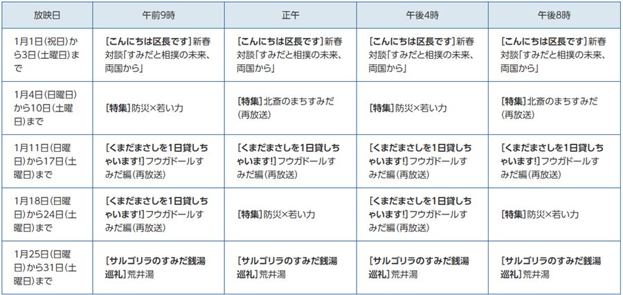 毎日、午前9時、正午、午後4時・8時から地上デジタル11チャンネルで放送しています(各15分間)。なお、放送終了後は区HPでご覧になれます。