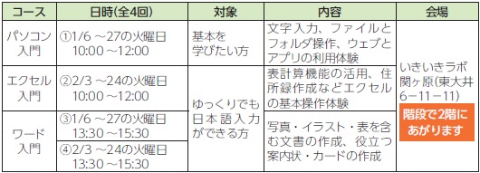 申込み・問合せ:12月8日(月)(必着)までに、電子申請かはがき、FAXで教室名、希望番号、住所、氏名(ふりがな)、年齢、電話番号、在勤の方はその旨を高齢者地域支援課高齢者活動支援担当(〒140-8715 品川区役所【電話】5742-6042【FAX】5742-6882)へ