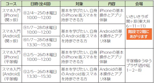 ※スマホ教室は、お持ちのスマートフォンの種類(iPhoneかAndroid)を確認してお申し込みください。当日は、必ずご自身のスマートフォンをご持参ください。