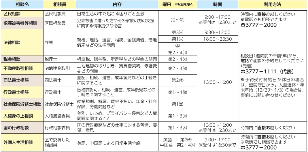 ひとりで悩まずご相談ください。区内在住か在勤、在学の方が対象です。