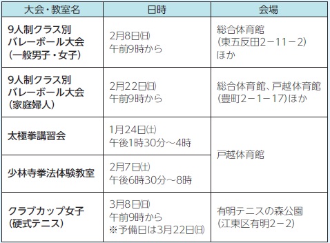 スポーツ スポーツ大会・教室 15/26 前の記事 次の記事 発行日 : 2026年01月11日 自治体名 : 東京都品川区 広報紙名 : 広報しながわ 令和8年1月11日号 詳しくはスポーツ協会ホームページ【HP】www.ssa.or.jpをご覧いただくかお問い合わせください。 問合せ:スポーツ協会 【電話】3449-4400【FAX】3449-4401 ※1月19日(月)はお休みです。 Tweet シェアする いきいきシニア 情報ひろば ~募集