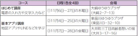 申込み:10月3日(金)(必着)までに、電話かはがき、FAXで希望番号、会場名、住所、氏名(ふりがな)、年齢、電話番号を品川区スマホ体験教室・よろず相談事務局(〒351-0101 埼玉県和光市白子1-3-40-4階【電話】0120-616-614〔土・日曜日、祝日を除く午前9時~午後5時〕【FAX】048-461-8486)へ