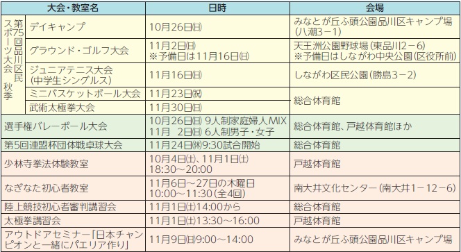 申込み・問合せ:10月21日(火)(消印有効)までに、電子申請かスポーツ推進課・体育館・地域センターで配布する申込書をスポーツ推進課地域スポーツ推進係(〒140-8715 品川区役所【電話】5742-6838【FAX】5742-6585)へ郵送か持参