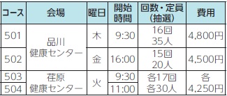 場所・申込み・問合せ:10月10日(金)(必着)までに、健康センターホームページ【HP】www.shinagawa.esforta.jp/の申し込みフォームか往復はがき(1コース1枚)、直接窓口(返信用はがき持参)に「トリムスクール」とし、コース番号、住所、氏名(ふりがな)、生年月日、電話番号を501・502は品川健康センター(〒140-0001 北品川3-11-22【電話】5782-8507【FAX】5782-8506)、503・504は荏原健康センター(〒141-0031 西五反田6-6-20【電話】5487-1317【FAX】5487-1313)へ