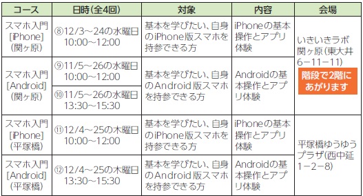 スマホ教室は、お持ちのスマートフォンの種類(iPhoneかAndroid)を確認してお申し込みください。当日は、必ずご自身のスマートフォンをご持参ください。