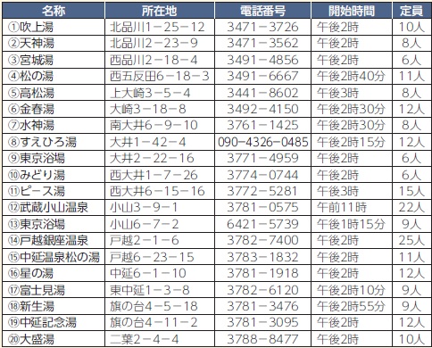 ・毎週木曜日午後7時までは、お楽しみプログラムに参加しなくても、浴場組合のサ-ビス事業として割引料金300円で入浴できます((12)武蔵小山温泉は午後4時まで)。利用するときに「出会いの湯カ-ド」をフロントか番台に提示してください。